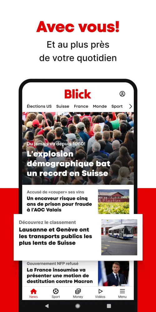 At the heart of the news that makes Switzerland vibrate, Blick is your go-to source for staying informed about French-speaking, Swiss, and international news. The Blick app brings you closer to the latest stories, covering a wide range of topics including news, sports, politics, economics, and society. With our app, you can enjoy not just articles but also enriching video content and engaging podcasts.
