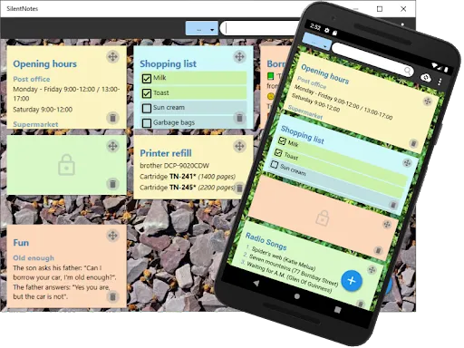 SilentNotes is a note taking app which respects your privacy. It doesn't collect personal data, runs free of ads and is an open source (FOSS) software. Write your notes in a comfortable WYSIWYG editor with basic formatting like headers or lists, and synchronize them end-to-end encrypted between Android and Windows devices.
