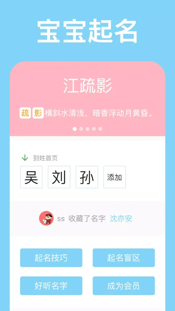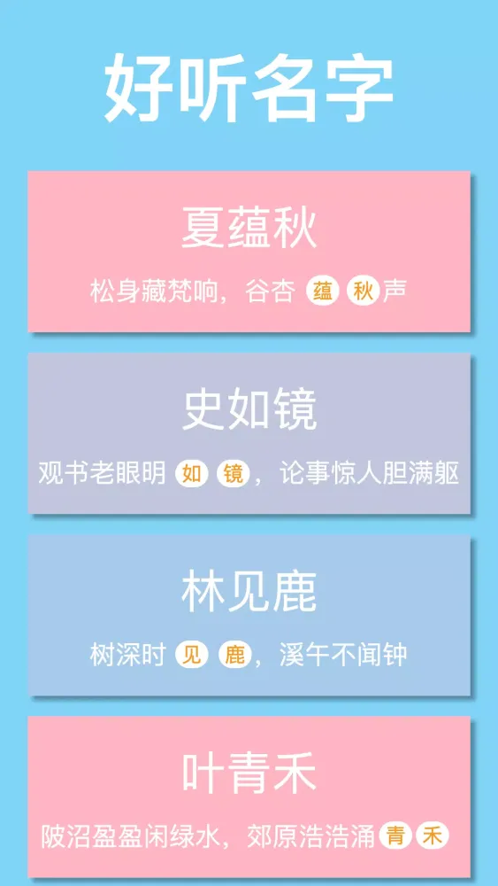山水起名 is a powerful application designed to help parents find the perfect name for their children. Drawing inspiration from poetry, idioms, high-frequency words, and homophones, this app expands your naming possibilities. For example, using idioms like "有章可循" (yǒu zhāng kě xún) can be creatively transformed into names like "张可循" (Zhāng Kěxún), while "不可理喻" (bù kě lǐ yù) can become "李可喻" (Lǐ Kěyù). Similarly, poetic lines such as "疏影横斜水清浅,暗香浮动月黄昏" (shū yǐng héng xié shuǐ qīng qiǎn, àn xiāng fú dòng yuè huáng hūn) can inspire names like "江疏影" (Jiāng Shūyǐng).
