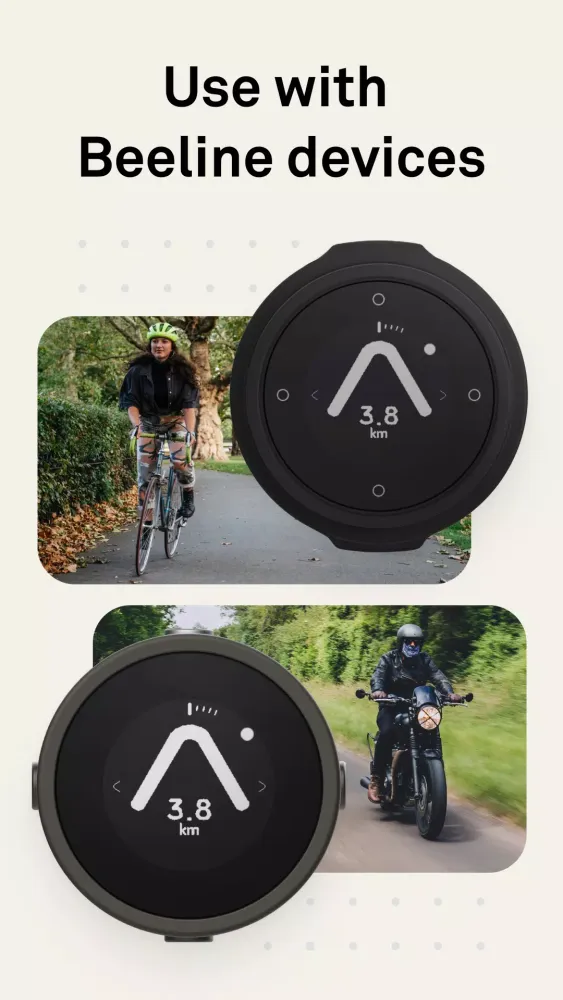 Beeline works seamlessly with the Beeline Velo and Beeline Moto devices, which are advanced (motor)cycle computers with superior navigation capabilities. To fully utilize these features, sign-up is required.