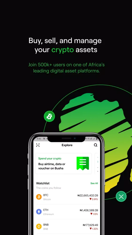Busha is Nigeria's leading SEC-licensed cryptocurrency exchange app, designed to simplify your crypto trading experience. With just a few taps, you can buy, sell, swap, securely store, and spend Bitcoin, Ethereum, Stablecoins, and various other cryptocurrencies instantly. Whether you're a seasoned trader or a crypto enthusiast, Busha offers a user-friendly interface that makes navigating the world of cryptocurrencies effortless.