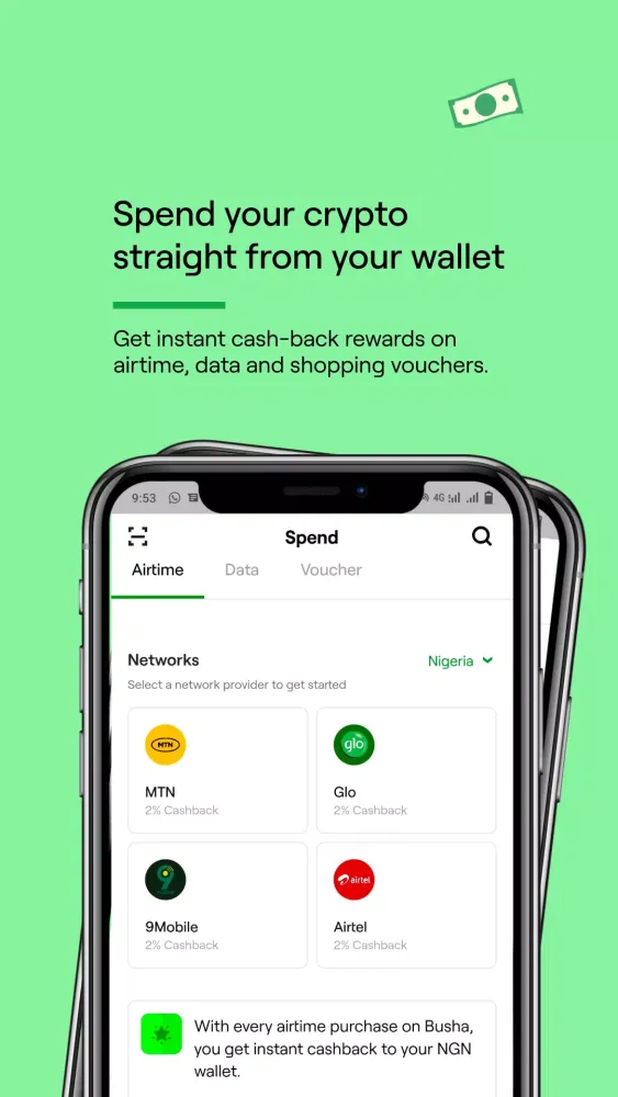 - Busha Spend: Use your Busha wallet to purchase airtime and data subscriptions directly, earning instant cashback to your wallet.