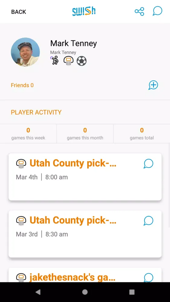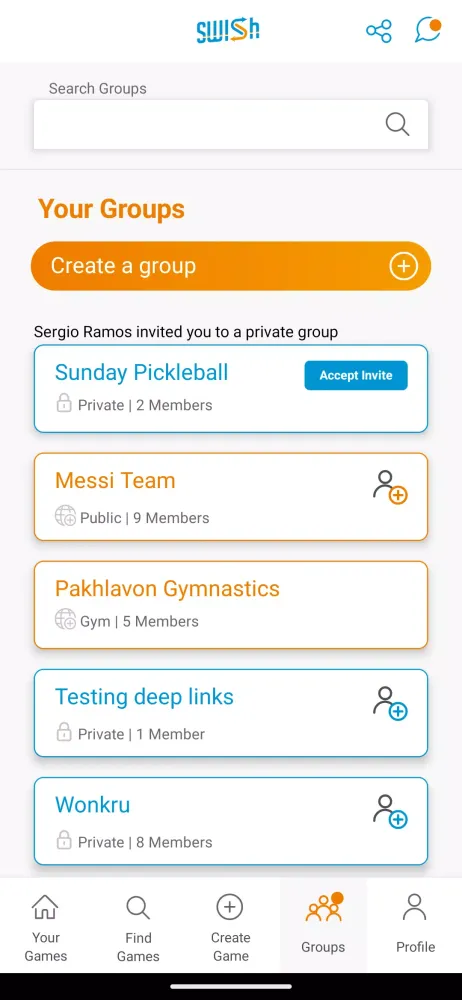With Swish, you can create and manage player groups to organize your pick-up games seamlessly. If you have a regular group of friends you love playing with, you can form a private group where you can create and post games exclusively for your members. Alternatively, if you enjoy meeting new people and playing with different players, you can join public groups. These groups are visible to all users, allowing anyone to post and join public sporting games.