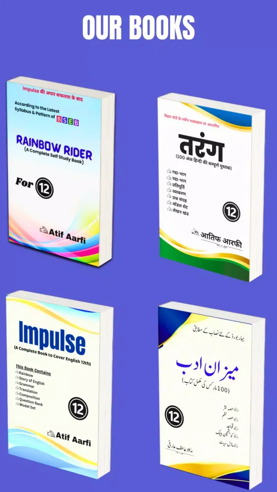 - Books: From literature to grammar, our collection includes essential resources such as Rainbow Rider (for BSEB 12th English), Impulse (for BSEB 12th English), Tarang (for BSEB 12th Hindi), Meezane Adab (for BSEB 12th Urdu), and Tricky English Grammar. We also offer specialized books like Diamond Speaking Book for English-speaking enthusiasts.