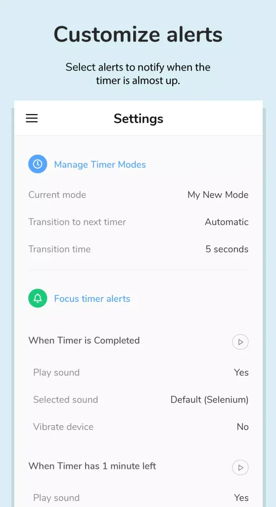 - Repeated Alerts: Repeated completed alerts ensure you don't miss any important transitions.