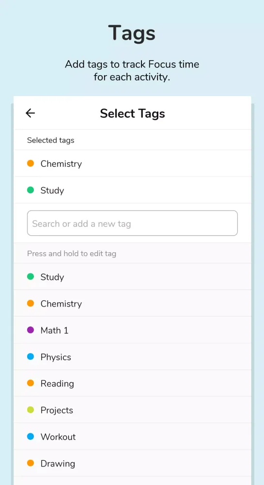 - Tag Sessions: Tag your Focus and Rest sessions to keep track of distractions and monitor your progress.