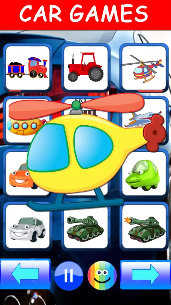 Interactive Interface: The app simulates a child-friendly interface with colorful images of different vehicles. Children can easily tap on the screen to see photos of the vehicles and hear their corresponding sounds.