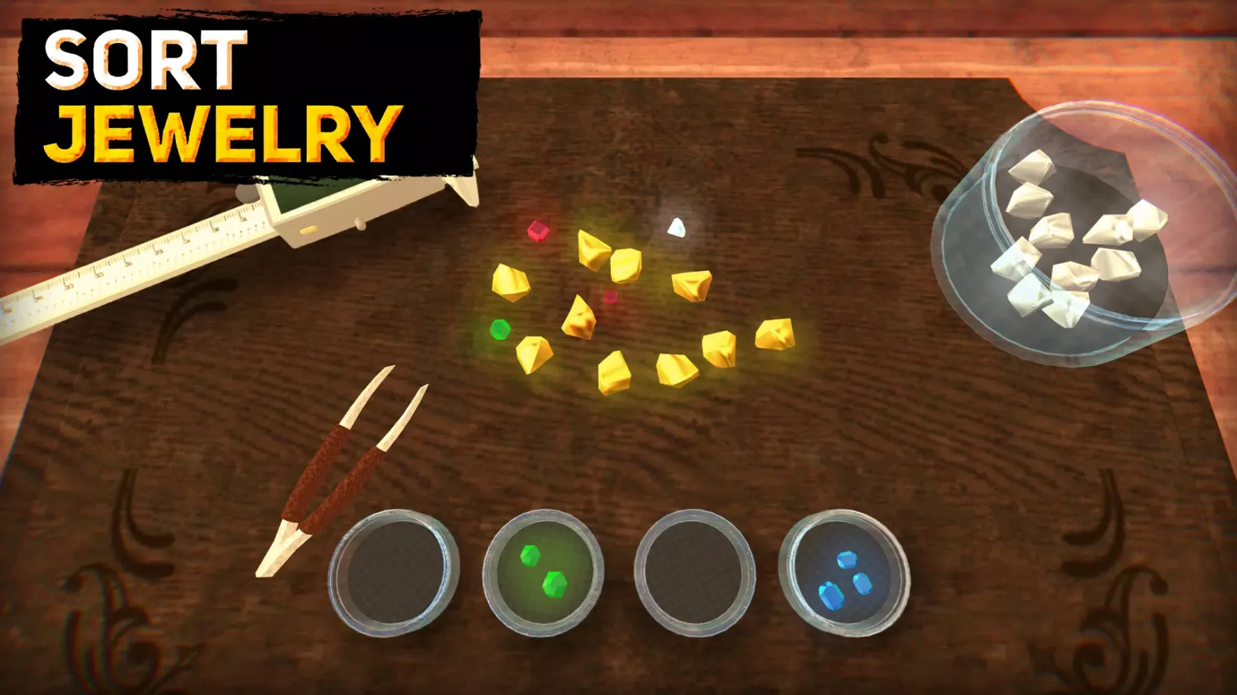 - 在分类台上对珠宝进行分类。