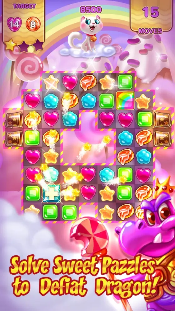In this exhilarating adventure, you'll encounter hundreds of unique levels, each packed with delicious challenges. Solve puzzles and crunch candies before they are stolen by the mischievous Dragon King. Along the way, you'll unlock sparkling boosters that will provide crucial support during the most challenging moments of your journey.