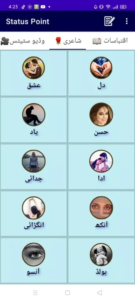 Status Point is a remarkable application designed to cater to a diverse audience seeking inspiration, creativity, and spiritual upliftment. Whether you're looking for poetic verses, profound quotations, or Islamic wisdom, this app provides a comprehensive collection of content tailored for sharing across multiple social platforms. The primary goal of Status Point is to empower users with engaging material that they can easily post on popular social networks such as Facebook, WhatsApp, Instagram, and Twitter.