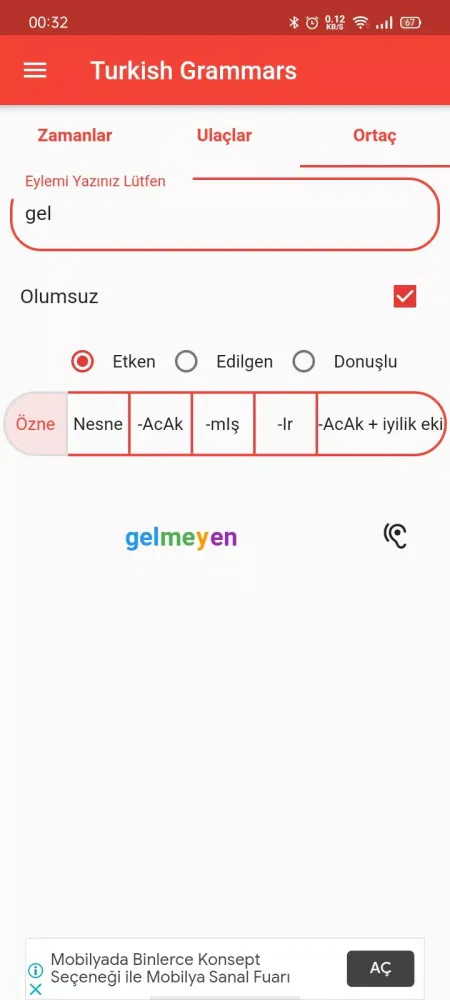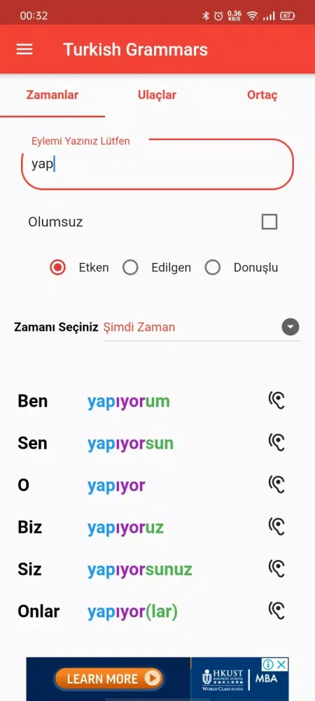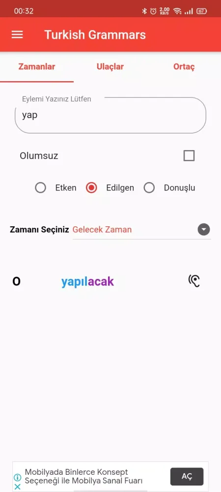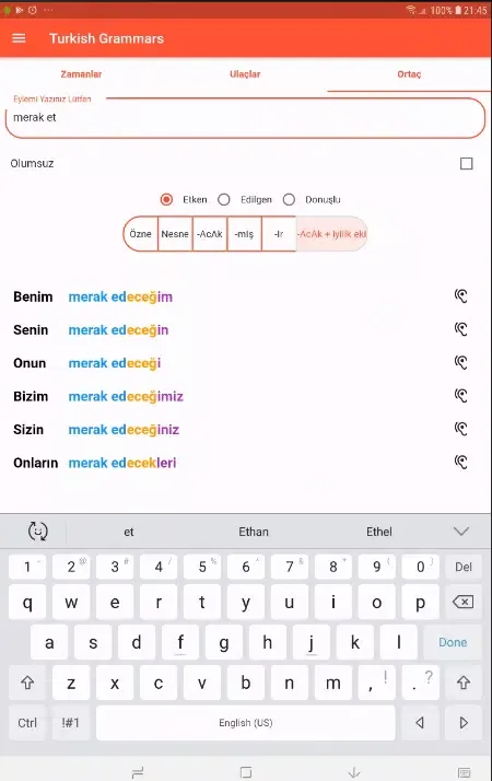 At the heart of "Turkish Grammars" lies its focus on verb conjugation, which is one of the most critical components of any language. The app provides an extensive list of tenses and participles presented in three distinct forms: active, passive, and reflexive. Each form is meticulously explained with examples, ensuring that users not only memorize but truly understand how these grammatical structures function within sentences. By offering such detailed explanations, the app ensures that even beginners can grasp complex concepts without feeling overwhelmed.