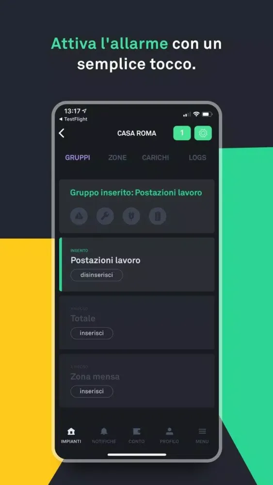 - Control Groups: Easily activate or deactivate your alarm groups, whether total or individual room-based.