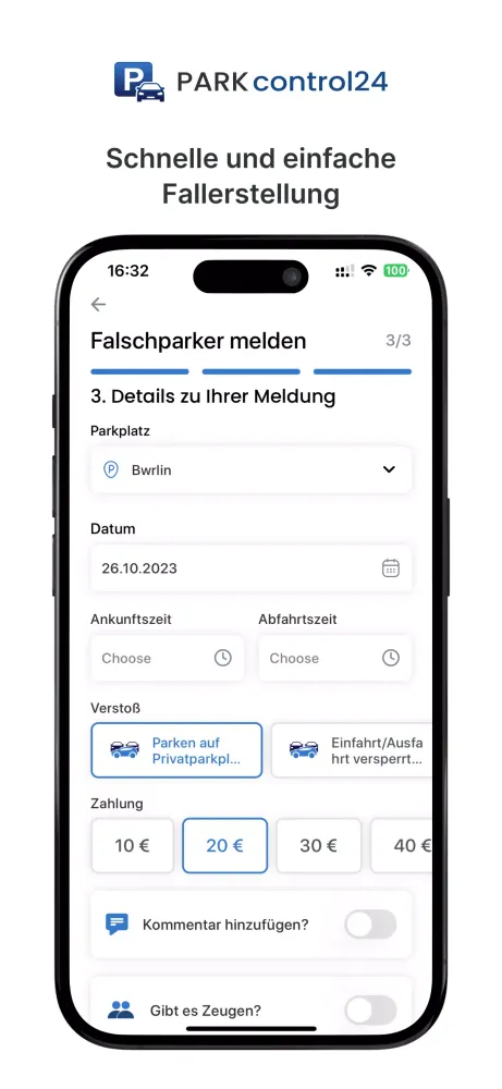 PARKcontrol24 offers a smart and legally secure solution for tackling the issue of unauthorized parking in private and commercial spaces. Our application streamlines the process of documenting and reporting illegal parking incidents. By using our intuitive interface, you can quickly capture evidence of illegal parking and submit it to our team of traffic law experts. We handle all subsequent correspondence and requests from the property owners. In the event of a successful report, you have the opportunity to earn up to €40 per submission. We guarantee that there are no costs or risks involved for you!