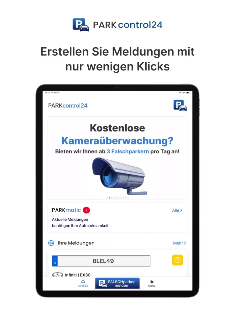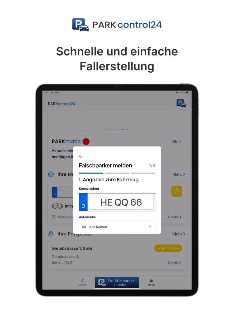 Note: Currently, our services are available exclusively within Germany and are limited to vehicles with German license plates. The app is designed for users who own private parking spaces. Reporting incidents on public roads is not permitted.