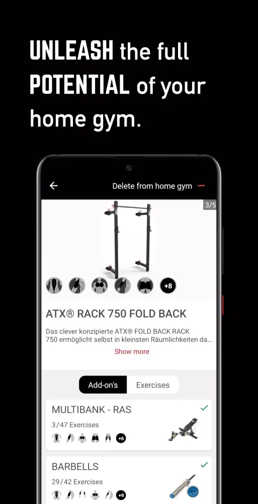 For those who own ATX training equipment, the app serves as an invaluable resource. Discover creative ways to use your existing gear and explore endless possibilities for expanding your home gym setup. Choose from a wide range of ATX products and accessories seamlessly within the app. Thanks to its direct link to official ATX dealers, acquiring new equipment or innovative upgrades is just a click away. Additionally, each piece of equipment is accompanied by instructional videos demonstrating all possible exercises, making full use of your home gym easier than ever before.