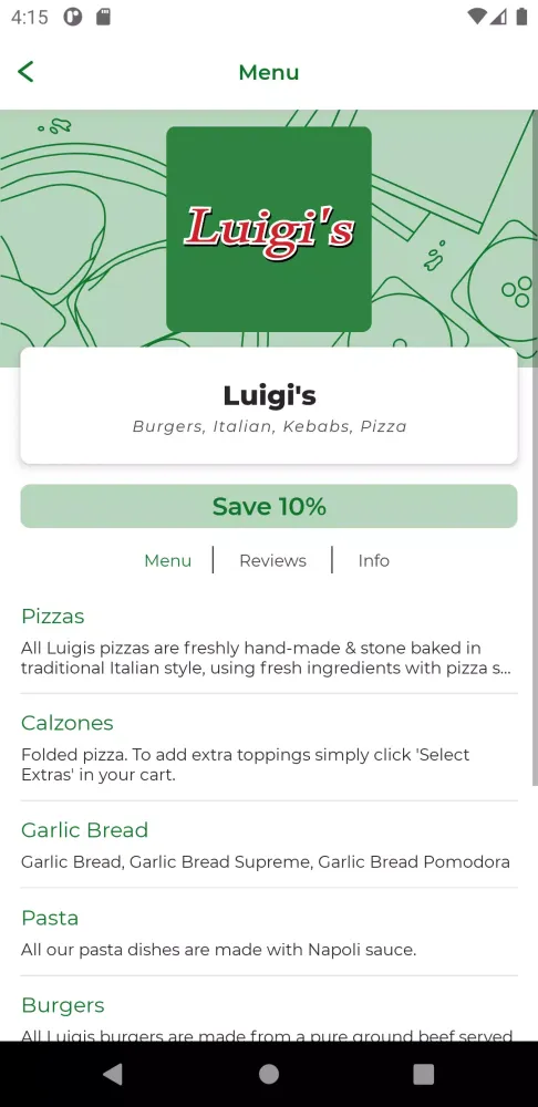 Another highlight of the app is its user-friendly interface, which provides easy navigation through the menu. You'll find a wide range of delicious options to suit any taste preference, accompanied by detailed descriptions and images to help you make informed choices. The optional extras feature lets you add those little touches—like extra toppings or sauces—that elevate your meal from ordinary to extraordinary. And if you're unsure about the location of Luigi's, don't worry! The app includes a handy map that shows exactly where we are, along with our opening hours and contact details for added convenience.
