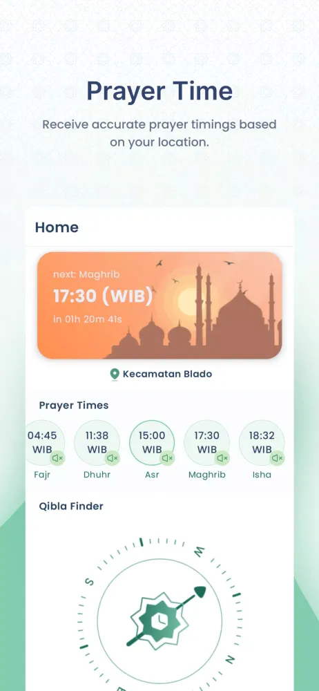 - Qibla Direction Finder: Effortlessly determine the correct orientation towards Mecca using your device's sensors.