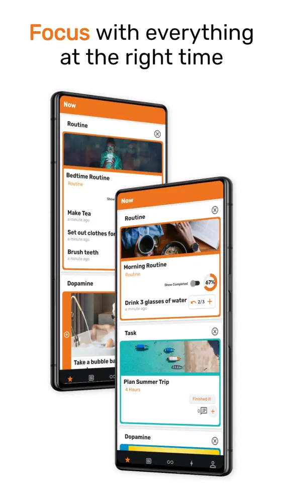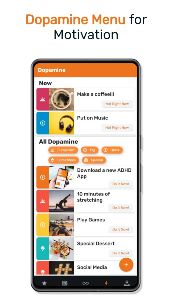 Discover a curated list of activities that boost your energy and motivation. The Dopamine menu helps you find the right activity without getting distracted, allowing you to stay productive and engaged.