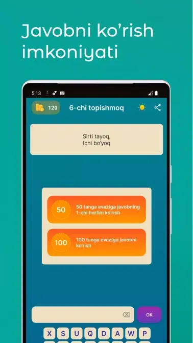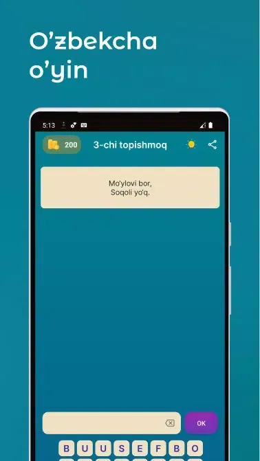 The "Topishmoqlar o'yini - 300-ta..." is an engaging and entertaining application designed to immerse you in the world of Uzbek traditional riddles. This game offers a delightful experience for those who enjoy solving puzzles while learning more about Uzbek culture. With 300 unique levels, each level presents a new challenge that will test your wit and knowledge. Whether you're a fan of wordplay or simply looking for a fun way to pass the time, this app promises to deliver hours of enjoyment.