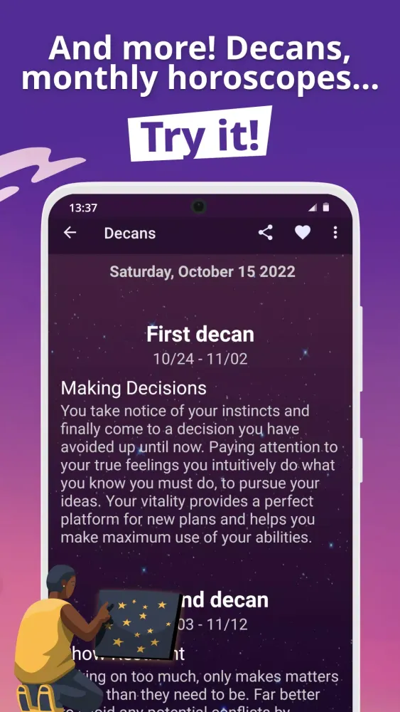 At the heart of the "Scorpio Daily Horoscope" lies its commitment to accuracy and personalization. The app offers daily, weekly, and monthly horoscopes tailored specifically to Scorpio, ensuring you stay informed about planetary influences affecting your sign. Each forecast delves into the nuances of Scorpio’s unique energy, offering practical guidance that resonates with both personal and professional aspects of life. For those seeking a more granular experience, the app also provides decan-specific horoscopes, catering to the distinct traits of the three Scorpio decans: first, second, and third. These detailed predictions help refine your understanding of your individual astrological path.