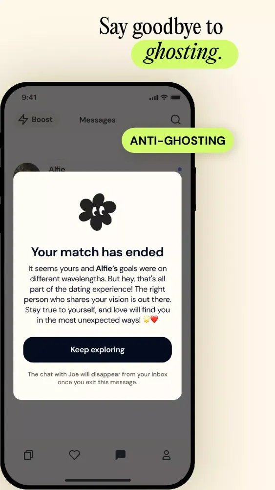 No more getting left on read. After's anti-ghosting feature ensures you're never left wondering. If a match isn't working out or messages aren't being exchanged, you are guided through a respectful process to end that match. Goodbye Ghosting handles sending that final message, making it easy for you to do the right thing without the awkwardness.