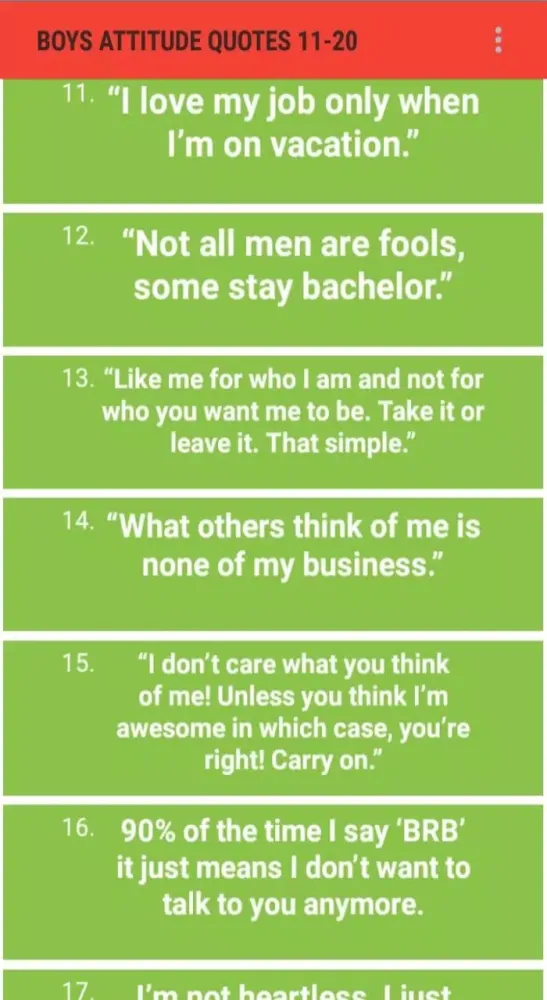 So why wait? Download the "Boys Attitude Status" app today and take your online presence to the next level. Impress your peers, spark conversations, and let your attitude do the talking. With this app, you'll never run out of clever and impactful ways to express yourself.
