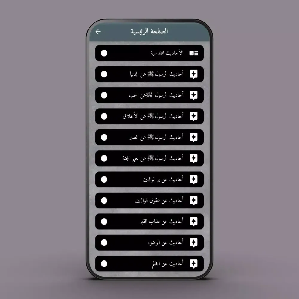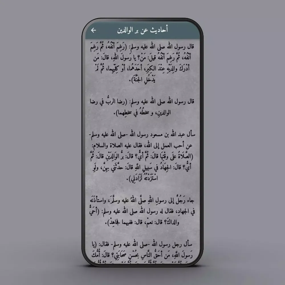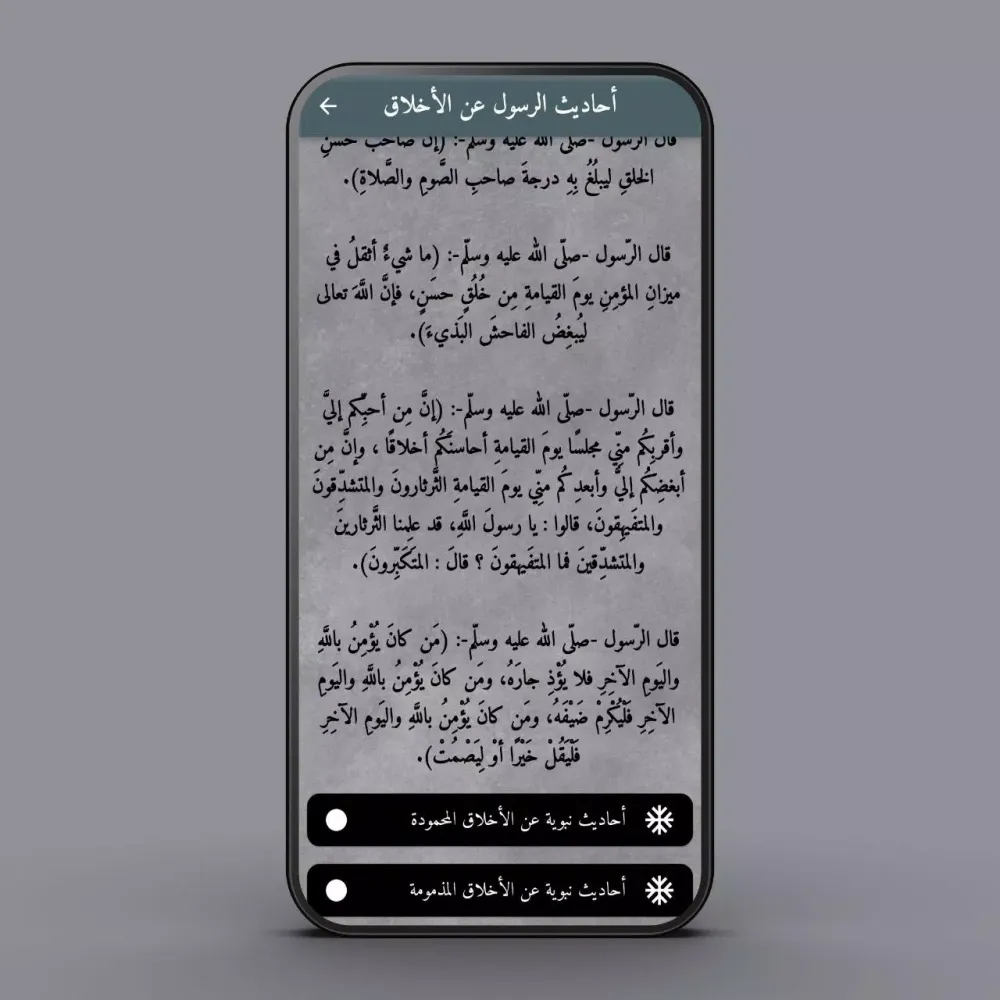 The app offers a variety of categories to suit different interests and needs. You can explore hadiths about honoring parents, the virtues of love, moral teachings, patience, and conversations about the bliss of heaven. Additionally, there are sections dedicated to discussing the torment of the grave, the Night of Power, and the importance of righteous actions. These categories provide a holistic view of the Prophet's teachings, covering both spiritual and practical aspects of life.