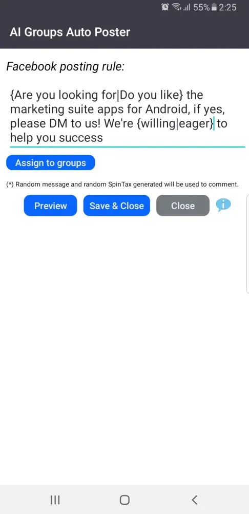 - SpinTax Support: Utilize SpinTax messages to ensure no duplicate content is posted. Each message is uniquely generated, enhancing engagement.