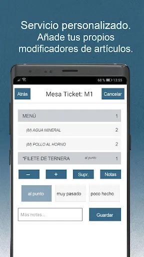- Servicio personalizado: Añade modificadores de artículos en la comanda para ofrecer el mejor servicio a tus clientes. Indica si la bebida es con hielo, el punto de la carne, etc.