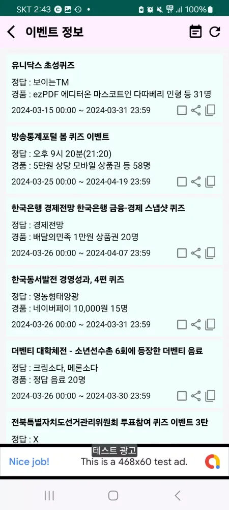 "퀴즈 정답 알리미" is a mobile application designed to simplify and enhance your experience with various quizzes. Whether you're a regular quiz enthusiast or someone looking to make the most of your daily challenges, this app ensures that you always have access to the correct answers at your fingertips. Developed with a focus on convenience and accuracy, "퀴즈 정답 알리미" addresses the frustration of searching for quiz solutions by providing timely updates and seamless sharing capabilities.