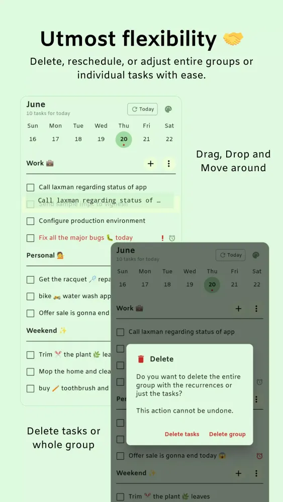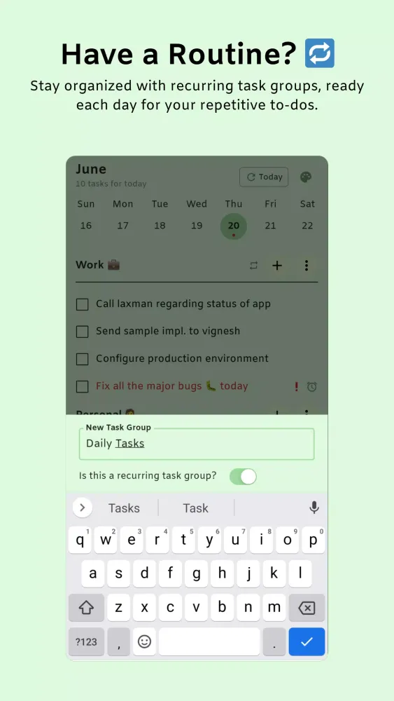 - Recurring Groups: Utilize recurring task groups to streamline your daily routine, ensuring all your repetitive to-dos are always ready.