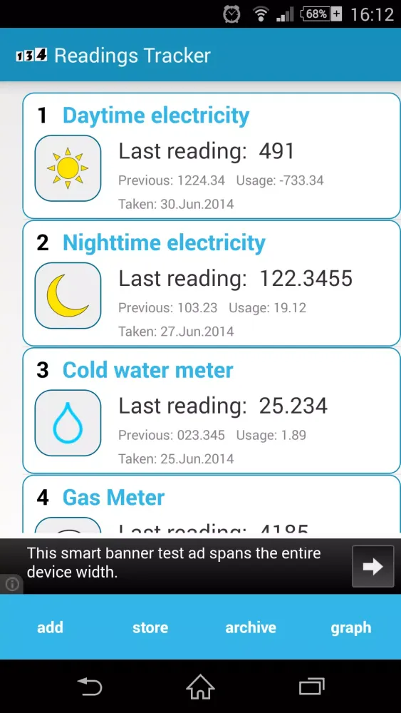 Readings Tracker is a straightforward and user-friendly application designed to help you monitor your electricity (daytime and nighttime), water (hot and cold), and gas usage. This app provides you with an organized archive containing detailed meter readings and graphical representations to give you a clear yearly overview of your consumption.