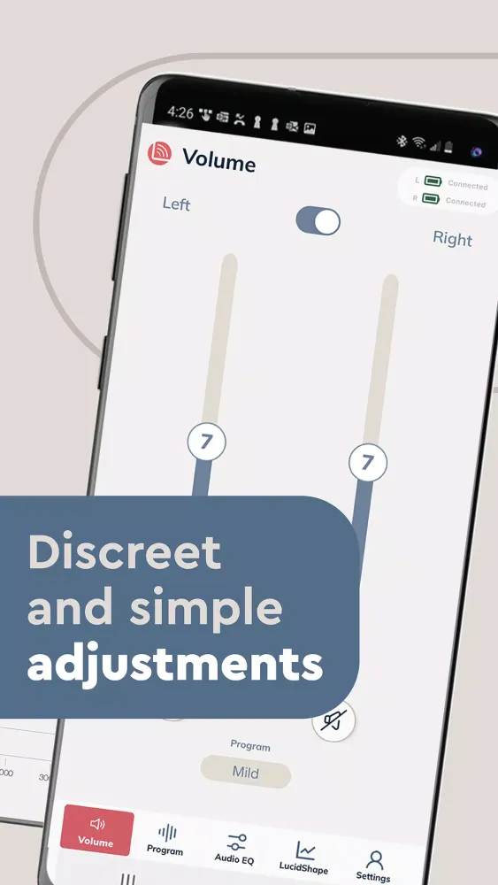 Volume adjustment is another essential aspect managed by the Lucid Hearing app. Easily increase or decrease the volume of your hearing aids with precision, ensuring optimal listening levels regardless of the situation. Moreover, the app offers dual-control options—allowing you to manage both hearing aids simultaneously or adjust them individually. This flexibility caters to users who may require slightly different settings for each ear.