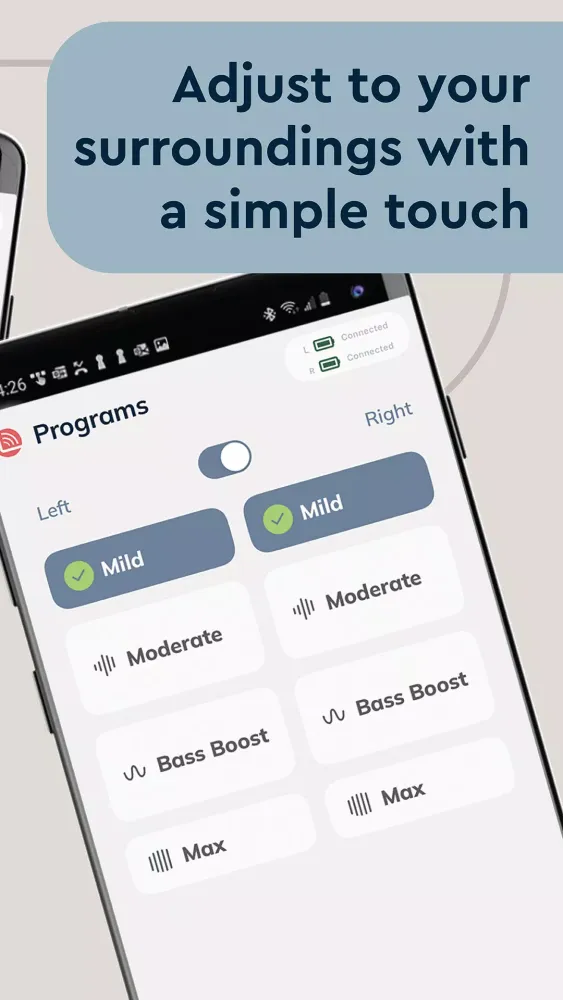 Another standout feature of the app is its advanced audio streaming capabilities. The equalizer (EQ) lets you tweak the treble, mids, and bass levels to optimize audio quality when streaming music, podcasts, or calls directly into your hearing aids. Additionally, the app supports ambient sound mixing, which blends external noises seamlessly with your audio feed. This balance helps maintain situational awareness while enjoying your favorite content without distraction. For those who frequently switch between different environments, the app’s program selection feature allows you to preset optimized settings for various scenarios such as noisy restaurants, quiet libraries, or bustling city streets.