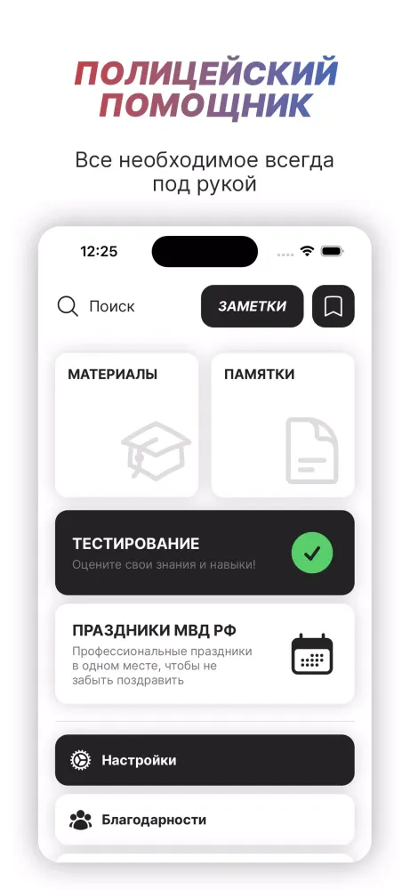 Police Helper is your go-to personal assistant designed specifically for law enforcement officers and students in governmental departments under the Ministry of Internal Affairs of Russia. The application provides up-to-date information on a wide range of topics essential for professionals in this field.