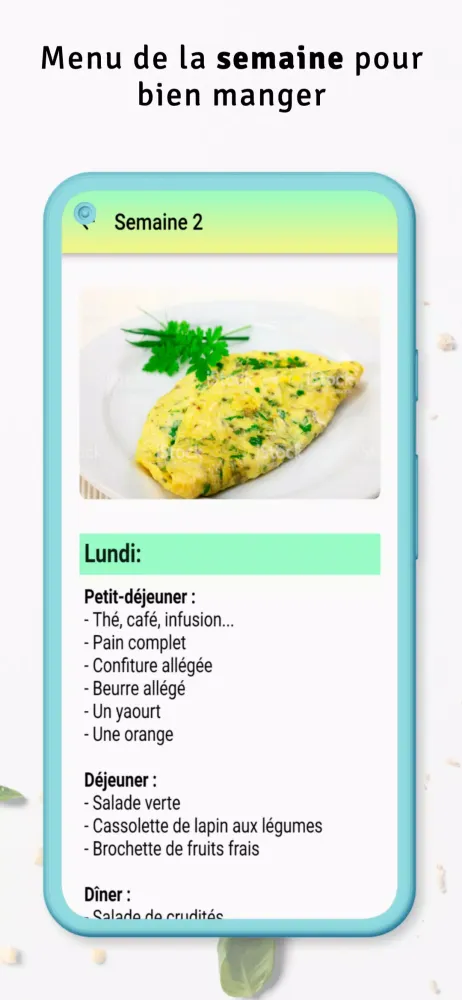 Another key benefit of "Alimentation saine équilibrée" is its ability to simplify meal planning. The app generates weekly menus that incorporate a variety of balanced meals, ensuring that no two days are alike. These menus are designed to cater to diverse tastes and preferences, making it easier to stick to a healthy routine. Additionally, the app caters to those seeking lighter alternatives, offering recipes that strike a perfect balance between flavor and nutrition.