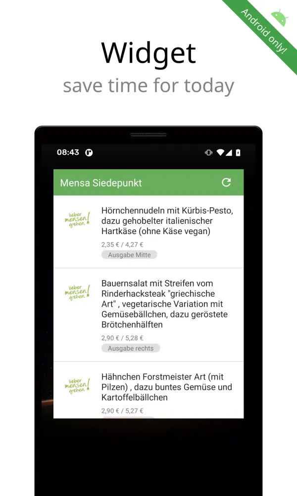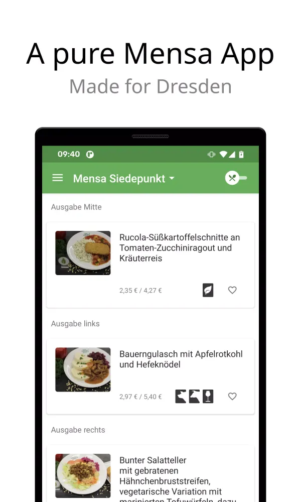 MensaPlus is a user-friendly application designed to help students and faculty members easily access the latest menus of student canteens in Dresden, Zittau, Tharandt, and Görlitz. Whether you're looking for today's special offers or simply planning your next meal, this app provides a clean and intuitive interface that makes it easy to browse through daily menu options right from your mobile device.