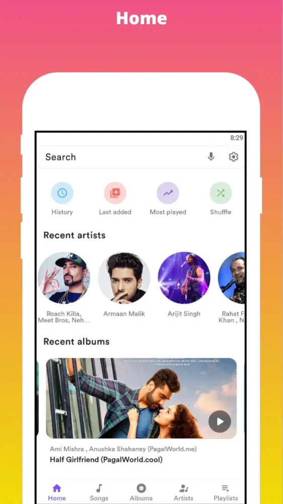The Home section allows you to easily access your recently played or top-played artists, albums, and favorite songs. This unique feature sets Alpha Music Player apart from other music applications.