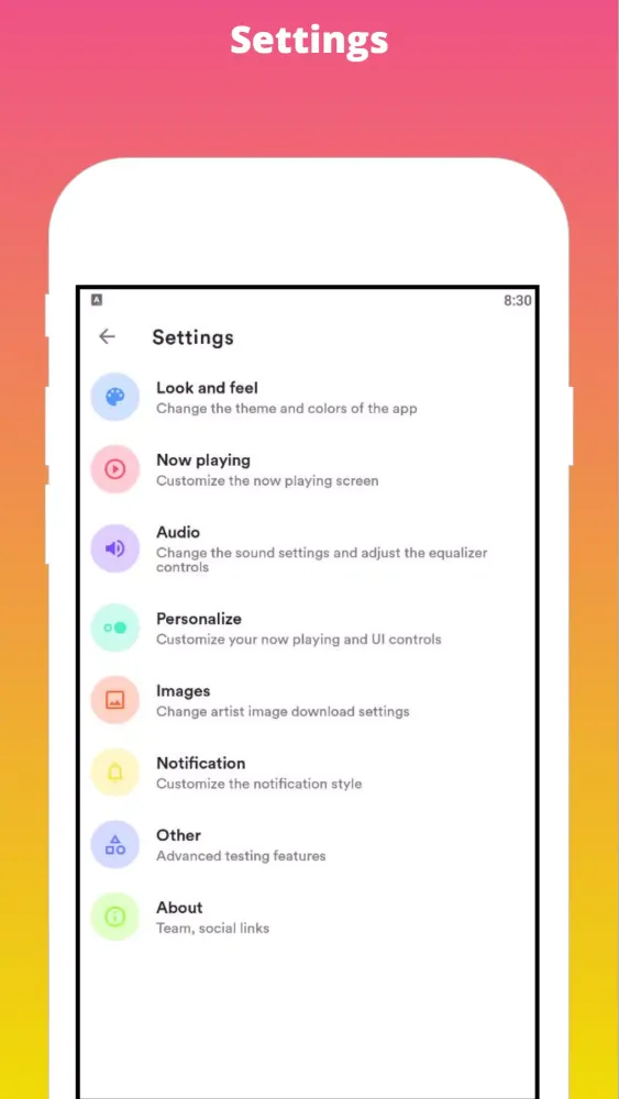 You can personalize your music experience by choosing from three distinct main themes: Clearly White, Kind of Dark, and Just Black, especially optimized for AMOLED displays. Additionally, you can select your favorite accent color from a wide range of options available in the color palette.