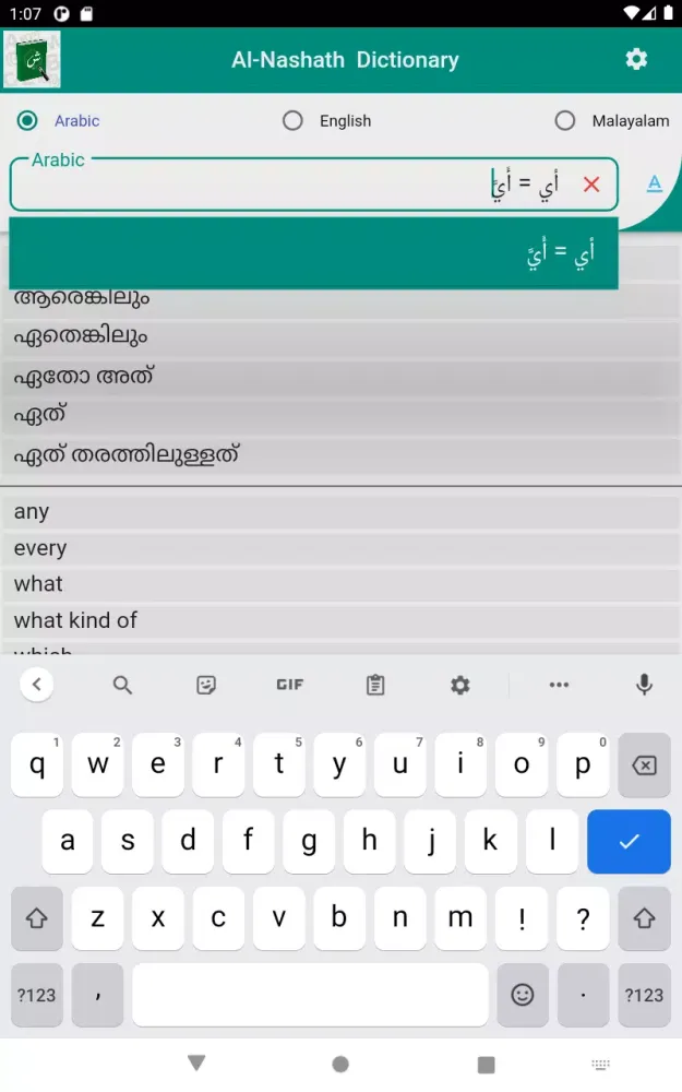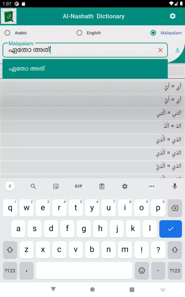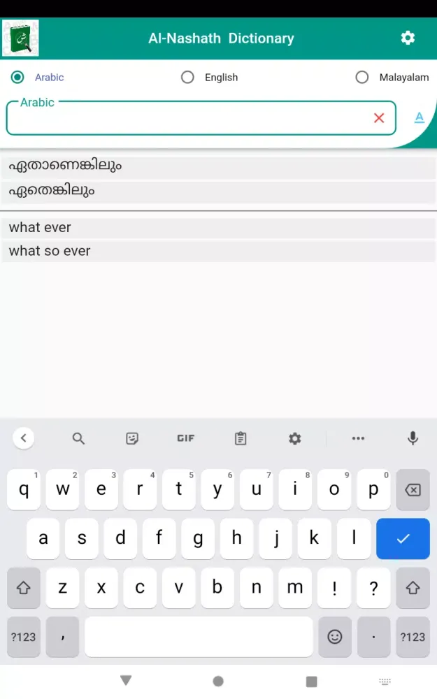 - Multi-Language Support: Search for meanings in three languages—Arabic, Malayalam, and English. When you look up words in English, the app will provide corresponding meanings in both Arabic and Malayalam.