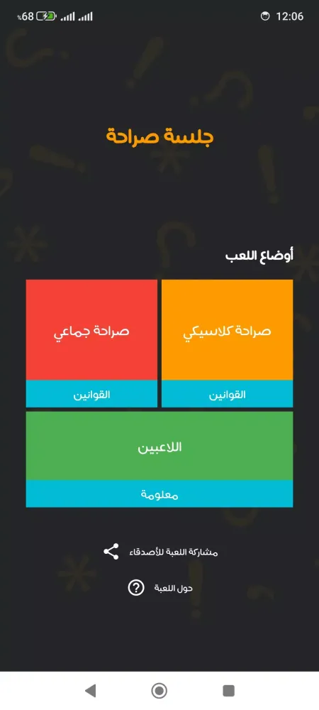 "جلسة صراحة," or the "Frankness Session," is an engaging and entertaining application designed to bring people together in a spirit of honesty and camaraderie. This game, also known as the "Confession Chair," is a perfect way to spice up gatherings with friends, family, or colleagues. Whether you're looking to break the ice, deepen connections, or simply enjoy some lighthearted fun, the Frankness Session offers a unique experience that combines spontaneity and authenticity.