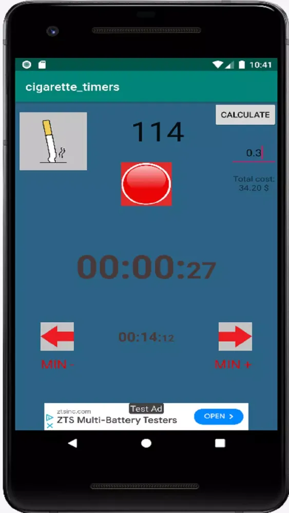 In addition to tracking the time intervals, the app features a cigarette counter that helps you keep track of how many cigarettes you've smoked. This feature allows you to set a specific cost for each cigarette, which in turn calculates the total financial expenditure on smoking. At the bottom of the screen, the elapsed time since your last cigarette is displayed, providing a clear visual reminder of your progress.