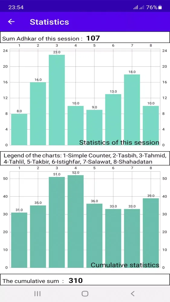 The Talking Misbaha performs several key functions to enhance user experience. Firstly, it teaches the pronunciation of incoming Dhikr using both text and audio formats. Users can learn phrases like Tasbih (glorification), Tahmid (tahmeed), Tahlil, Takbir (takbeer), Istighfar (seeking forgiveness from Allah), Salawat for the Messenger, peace be upon him, and the Shahadatan (two testimonies). Additionally, the app displays the virtue of each Dhikr based on Hadiths, reinforcing the spiritual value of these practices. Another critical function is the ability to count Dhikr sessions, providing both individual counts and cumulative statistics. These stats are visualized in charts, enabling users to track their progress and compare their efforts over time.