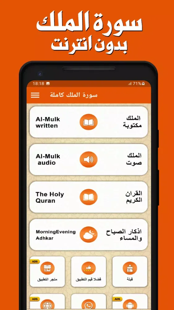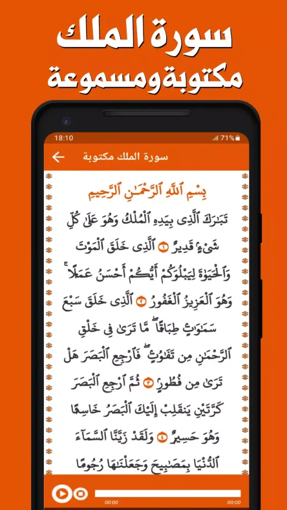 The "Surat Al-Mulk Without Internet" application is designed to provide users with an efficient and convenient way to access the complete text, audio, and recitation of Surah Al-Mulk. This app is particularly beneficial for individuals who wish to listen to the divine verses of the Quran without an active internet connection. By downloading the application, users can enjoy the soothing voice of the reciter, ensuring a high-quality listening experience anytime, anywhere.