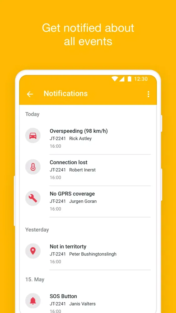 Set up automatic alerts for critical events such as speeding violations, territory entry/exit, and loss of GPS/GPRS signal. Receive notifications directly on your phone to ensure timely responses. Push notifications are also customizable for different alert groups, helping you stay proactive and informed.