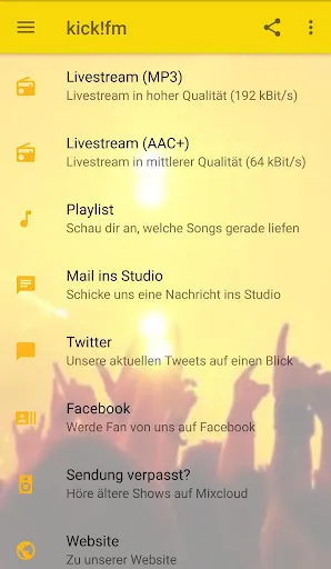 Mit unserer Android-App hast du kick!fm immer bei dir - höre den kick!fm-Livestream in 2 Qualitätsstufen, erfahre Neues von kick!fm bei Facebook und Twitter oder sende direkt eine Mail ins Studio.