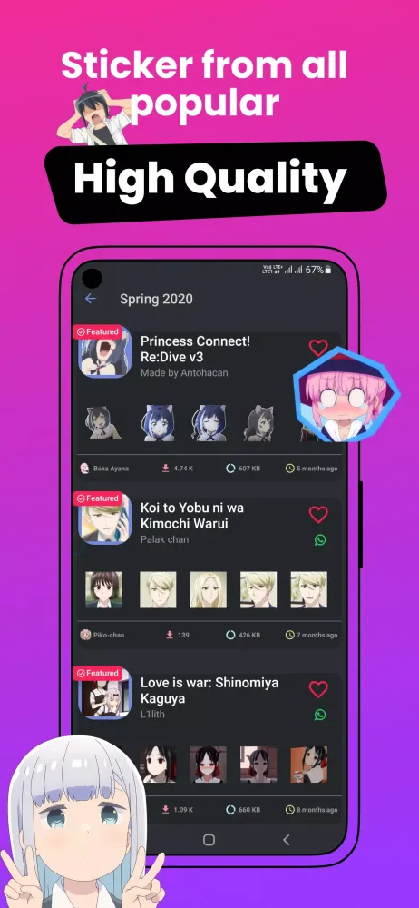 With +999K Anime Stickers WASticker, you'll have access to a vast library of categories featuring some of the most popular anime characters and themes. From seasonal updates like Summer 2023 and Winter 2022 collections to exclusive stickers based on trending shows such as Zom 100: Zombie, BanG Dream!, and Dark Gathering, there’s always something fresh and exciting to explore. Additionally, you’ll find specialized categories like male and female anime stickers, meme reaction stickers, and even original creations from our community of passionate fans.