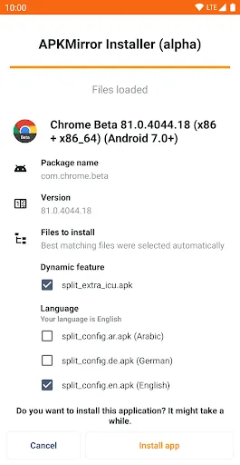Each .apkm file is comprised of a base APK and a number of split APKs. Once you've installed APK Mirror Installer and downloaded the .apkm file you'd like to install, simply tap on it or use APKMirror Installer to find the download location. You will be able to see the exact contents of each .apkm file and select only the splits you want to install to save space on your device.