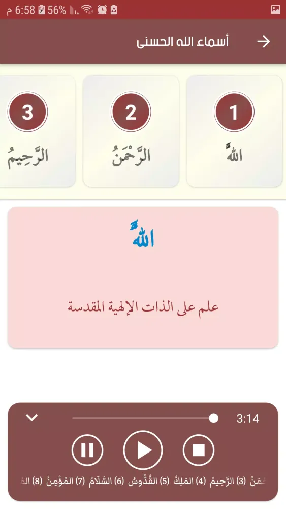The app also offers a special section for the Most Beautiful Names of Allah (Asma' Allah Al-Husna), complete with detailed explanations and audio recordings recited in a melodious voice. This feature allows users to not only learn about the names of Allah but also to immerse themselves in their recitation and contemplation.