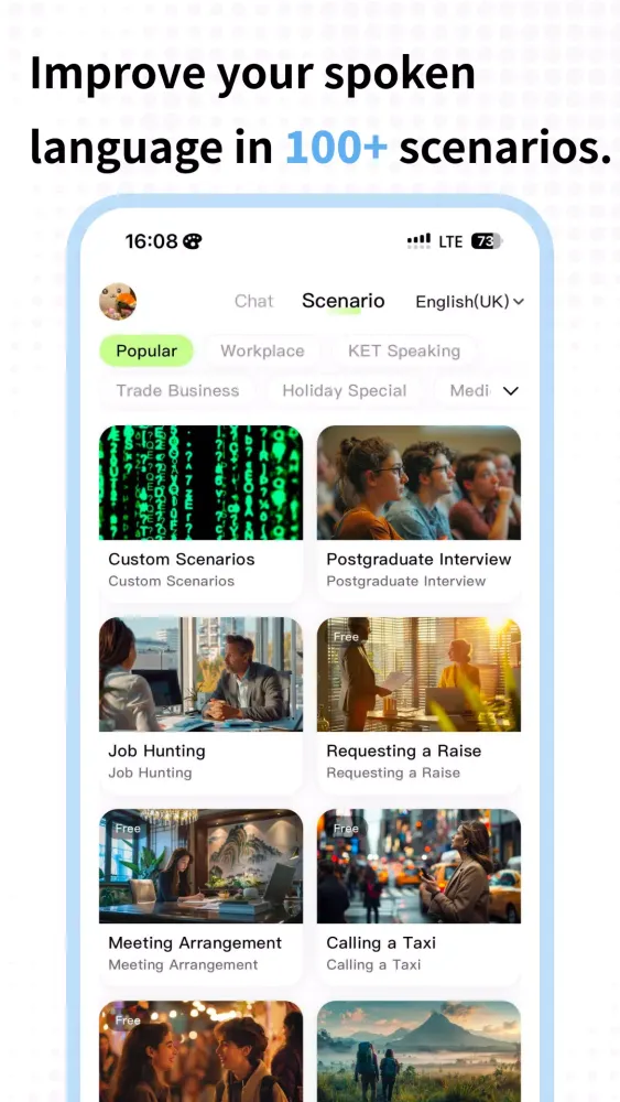 TalkAI offers diverse scenarios tailored for various contexts, such as language exams, professional settings, and everyday life. This comprehensive approach ensures you're well-prepared for any situation, whether you're a beginner or an advanced learner.